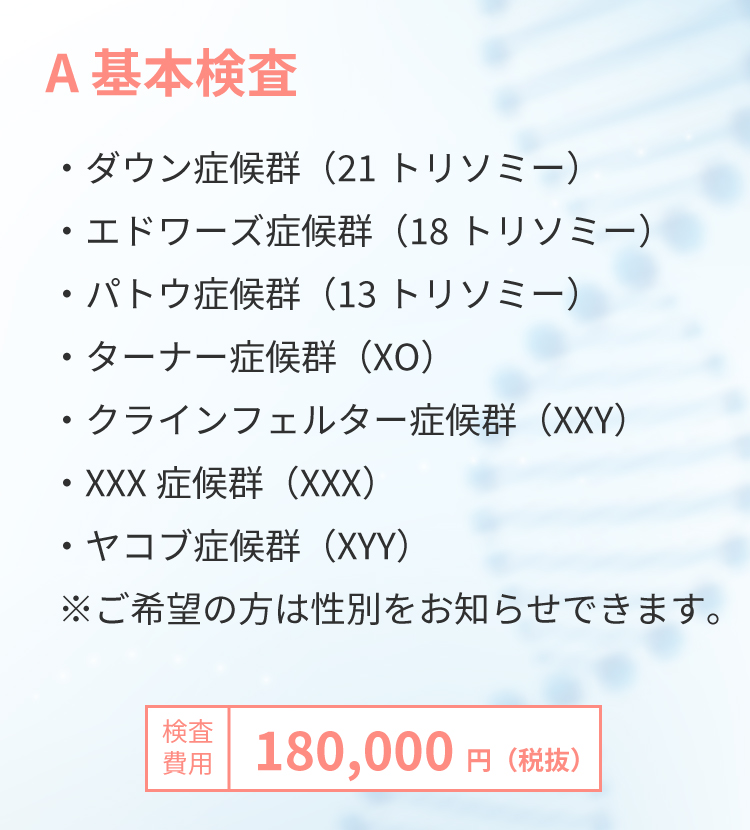 B 全染色体検査、C 微小欠失検査プランもご用意しております。詳細につきましてはお問い合わせください。